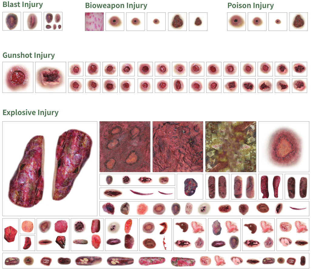 1)   Many kinds of injuries such as Explosive Injury, Blade Injury, Ionizing Radiation, Cold Injury, Poison, Crush Injury, Gunshot, Burn, Bioweapon, Bruises, Penetrating Injury, tangential wound, Tubular Wound, Abrasion, Contusion, Laceration, Fracture, etc., including mild, moderate, severe and critical